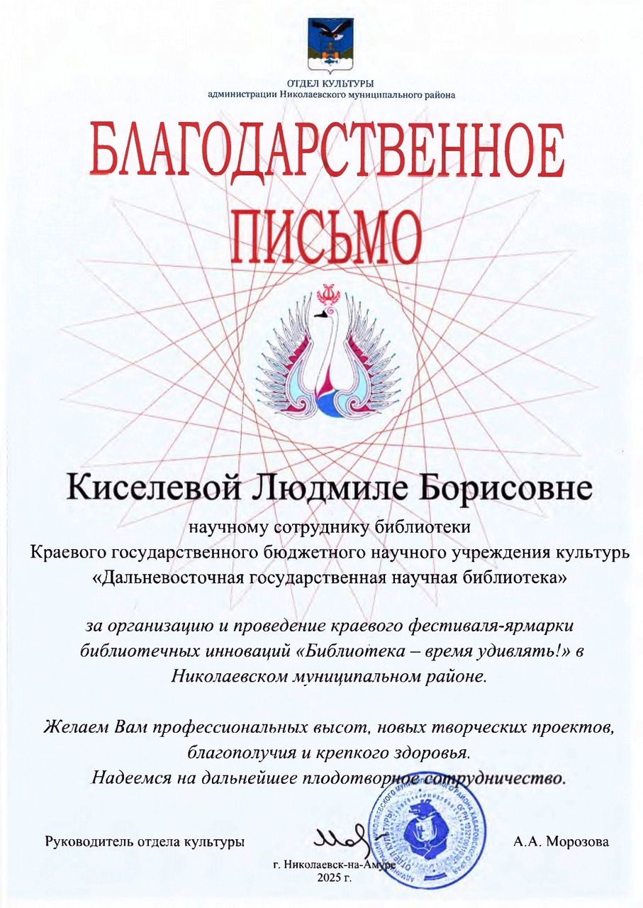 Благодарности от отдела культуры администрации Николаевского муниципального района