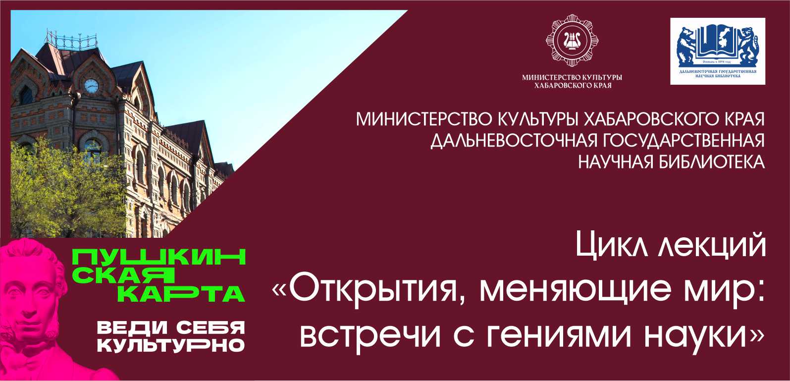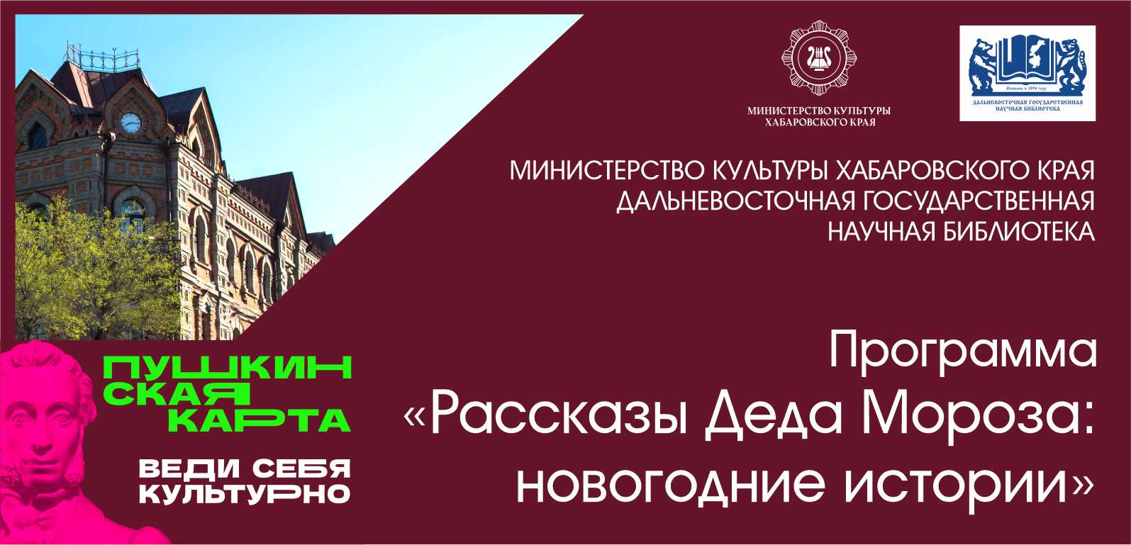 Проект направлен на популяризацию культурных мероприятий среди молодежи от 14 до 22 лет. С 1 января 2022 года каждый зарегистрировавшийся на портале «Госуслуги. Культура» получает банковскую карту, на балансе которой – 5 000 рублей. Потратить их можно в театрах, концертных залах, музеях и библиотеках до 31 декабря 2022 года. В рамках проекта «Пушкинская карта» Дальневосточная государственная научная библиотека приглашает на познавательные мероприятия, обзорные экскурсии по двум зданиям библиотеки: основное здание ДВГНБ, ул. Муравьёва-Амурского, 1, Центр книжных памятников ДВГНБ, ул. Калинина, 77а.