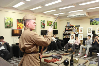 Сотрудники Дальневосточной межрегиональной молодёжной военно-исторической общественной организации «Амурский рубеж» познакомили с историей оружия времен Великой Отечественной войны гимназистов из гимназии № 5 г. Хабаровска и иностранных студентов из «Тихоокеанского государственного университета». Ребятам показали образцы вооружения, рассказали о конструкциях и технических характеристиках советского оружия.