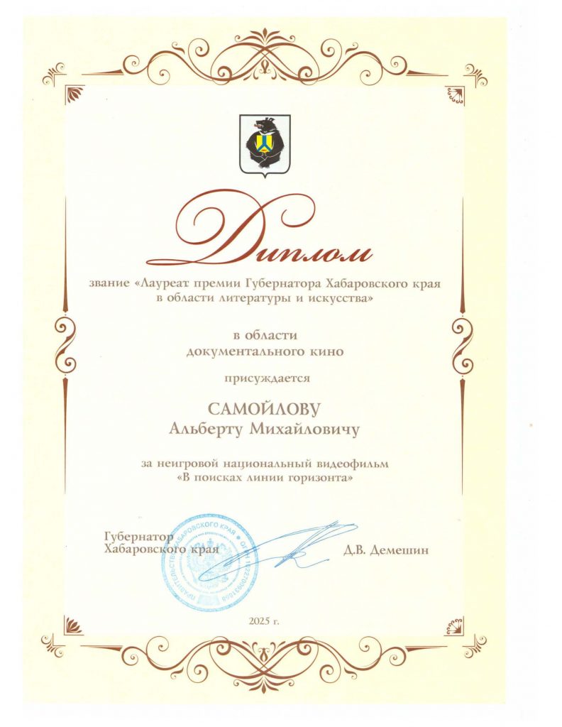Дорогие друзья! Делимся с вами радостной новостью. Альберт Самойлов – художественный руководитель ООО «Дальневосточная киностудия» и Ирина Филаткина – ст. научный сотрудник Дальневосточной государственной научной библиотеки, руководитель АНО «Лаборатория идей» стали лауреатами премии Губернатора Хабаровского края в области литературы и искусства в номинации «Документальное кино».