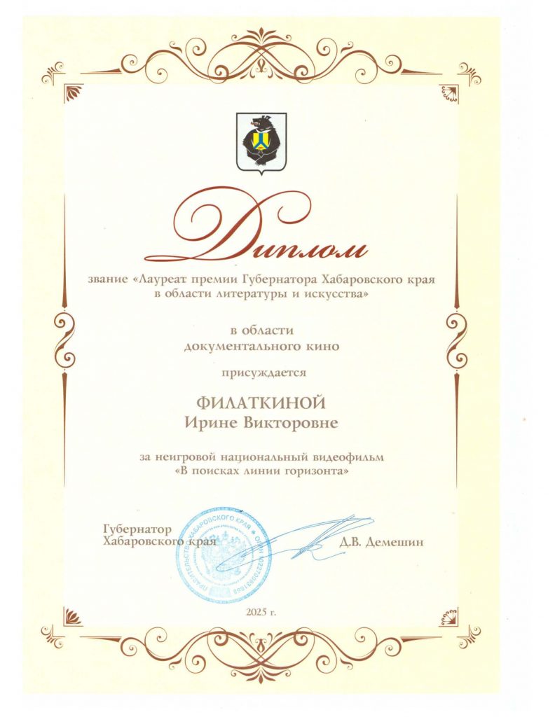 Премия присуждена за фильм «В поисках линии горизонта» о Заслуженном художнике Хабаровского края Германе Алексеевиче Палкине. Фильм создан в рамках проекта «Поколение классиков» при поддержке Президентского фонда культурных инициатив. И. Филаткина – автор сценария, А. Самойлов – оператор и режиссер.