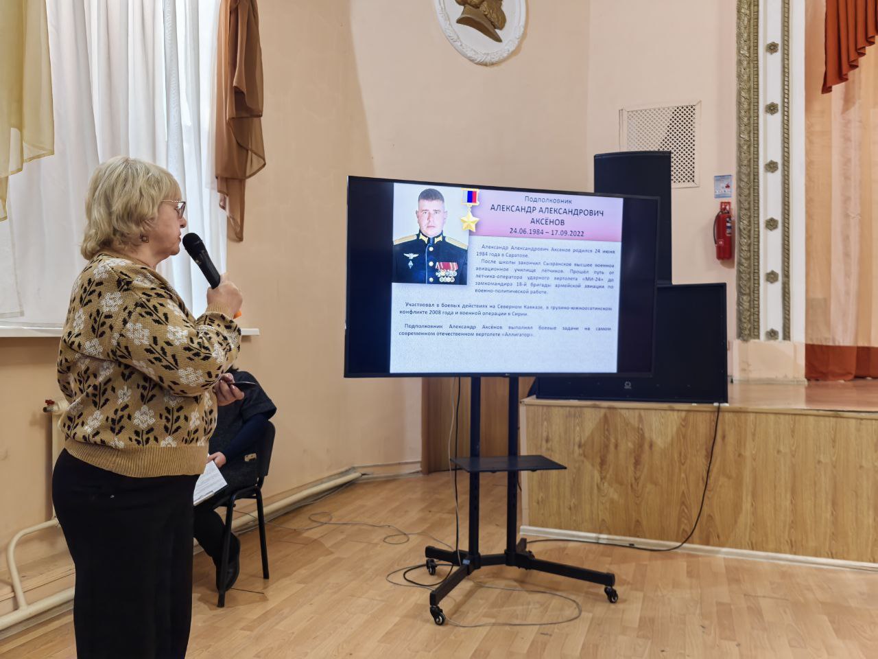 Рассказ сопровождался показом слайдовой презентации, а также был дополнен патриотическими видеороликами. В исполнении солистки ансамбля «Берега России» Виктории Борисовой прозвучали патриотические песни.