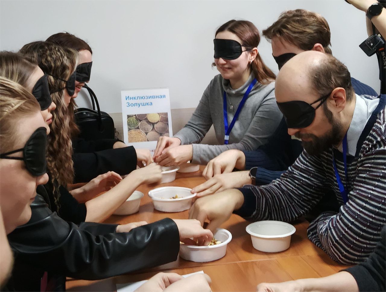 Участникам предоставили уникальную возможность почувствовать мир незрячих людей – с повязками на глазах они играли в адаптированные настольные игры и попробовали пройтись по улице с тростью. Команды состояли из четырёх зрячих участников и незрячего капитана из организации, который помогал ориентироваться в заданиях.