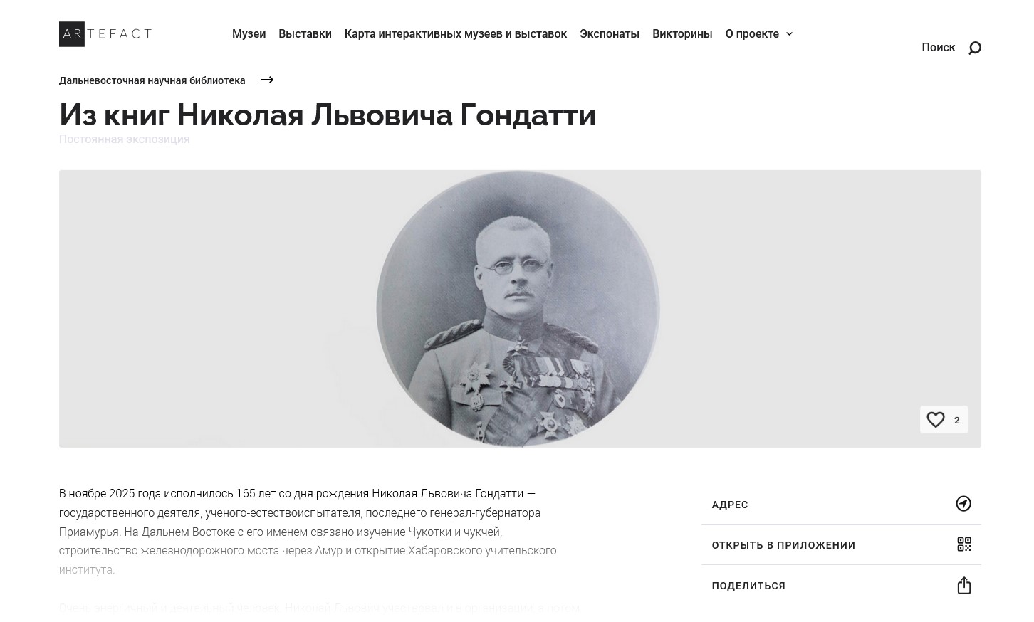 Посмотреть выставку можно на платформе «Артефакт»: https://ar.culture.ru/ru/exhibition/iz-knig-nikolaya-lvovicha-gondatti