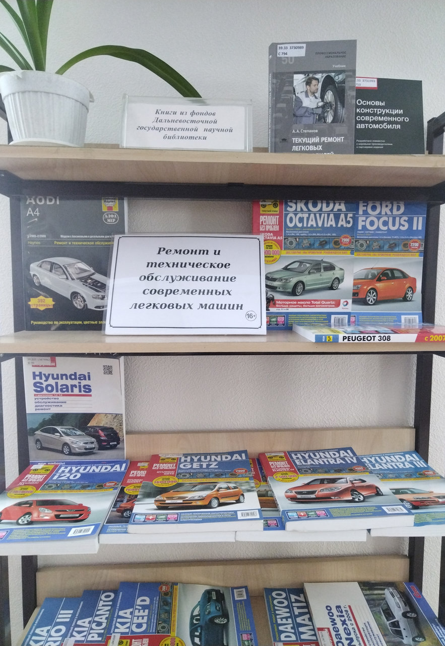 29 января отделом сельскохозяйственной литературы, нормативно-технической документации и библиографии в Хабаровском дорожно-строительном техникуме организована выставка по теме: «Техническое обслуживание и ремонт легковых автомобилей». На выставке представлены книги и журналы, в которых даны основные понятия, связанные с операциями технического обслуживания и ремонта легковых автомобилей. Рассмотрены вопросы технического обслуживания, диагностирования и ремонта легковых автомобилей. Цель мероприятия: дать необходимый теоретический и практический материал при подготовке студентов по профессии «Мастер по ремонту и обслуживанию автомобилей». Выставка предназначена для студентов учреждений среднего профессионального образования, может быть полезна всем желающим самостоятельно изучить вопросы технического обслуживания и ремонта легковых автомобилей.