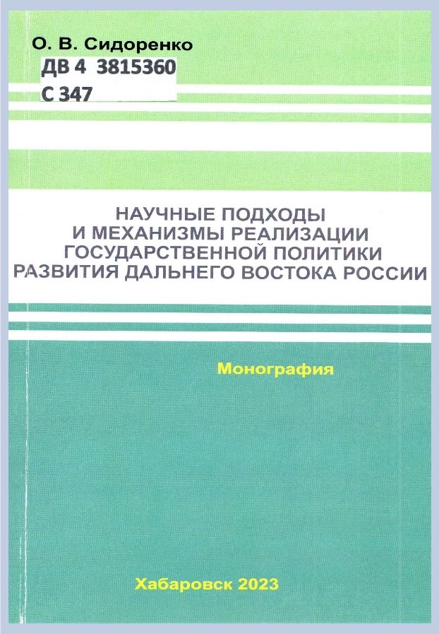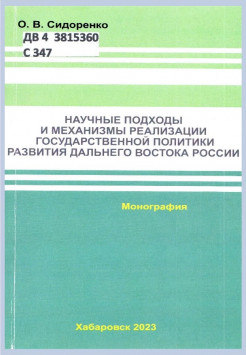 Сидоренко, О. В. Научные подходы и механизмы реализации государственной политики развития Дальнего Востока России : монография / О. В. Сидоренко ; Хабар. гос. акад. экономики и права. – Хабаровск : ХГУЭП, 2023. – 171 с. : ил. – Библиогр.: с. 140–160 (194 назв.) и в подстроч. примеч. – ISBN 978-5-7823-0772-1. – [ДВ 4 / С 347 3815360] |