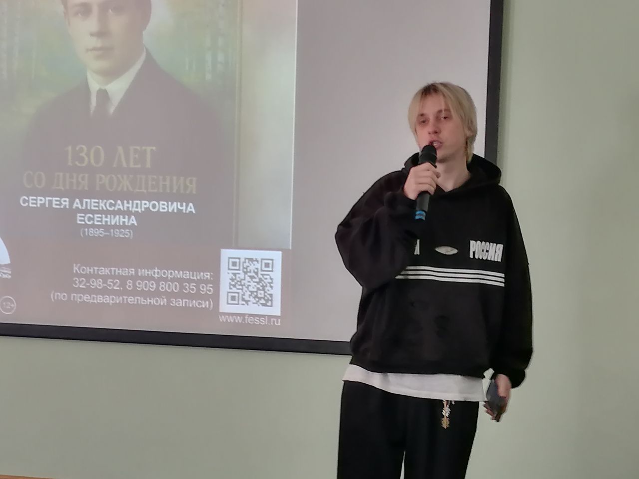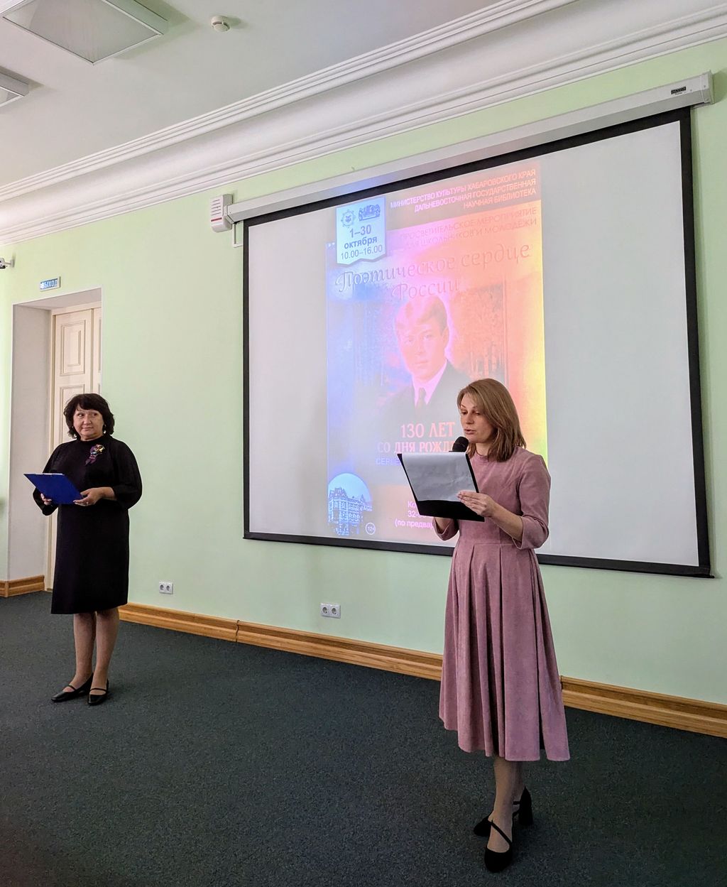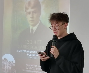 9 октября гостями Дальневосточной государственной научной библиотеки стали учащиеся старших классов МБОУ СОШ № 1 поселка Хор. Для них сотрудники библиотеки провели интерактивное культурно-просветительское мероприятие «России стихотворная душа», посвящённое 130-летию со дня рождения великого русского поэта С. А. Есенина. Гостей ждали выступления артистов с живыми исполнениями песен и романсов на стихи Есенина, интересные факты из жизни поэта, «есенинская» кинохроника, виртуальное путешествие по родным местам юбиляра, призовая литературная викторина. Особенную поэтическую атмосферу создали сами ребята, которые читали любимые стихи С. А. Есенина.