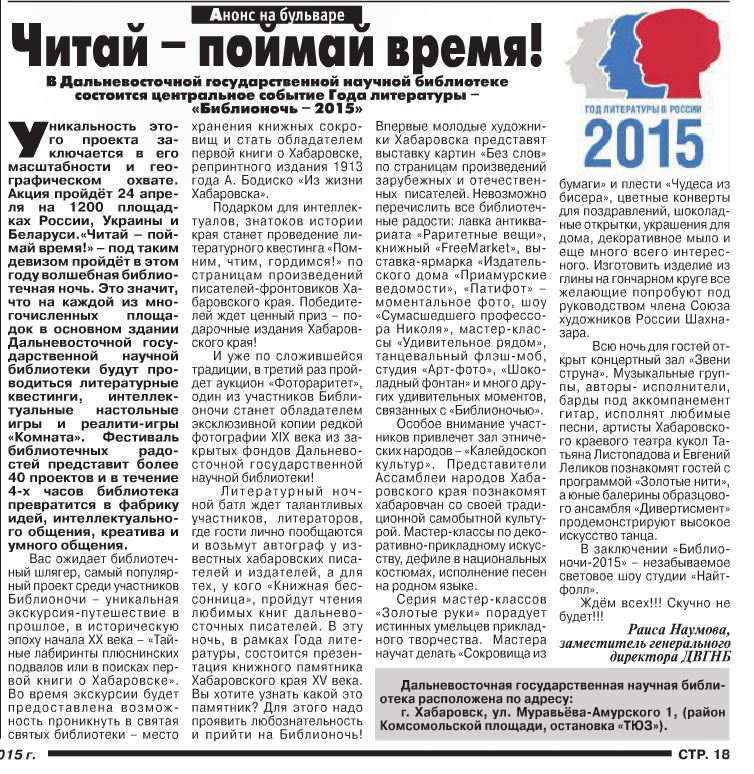 "Читай, поймай время!" о центральном событии года литературы в ДВГНБ "Библионочь - 2015" |