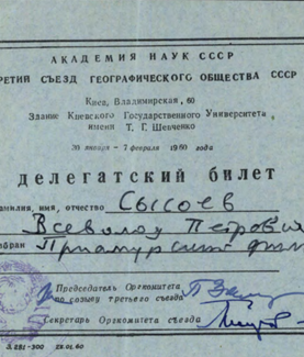 Делегатский билет на III съезд Географического общества СССР, 1960 (ГАХК. Ф. 1243. Оп. 1. Д. 158. Л. 3)