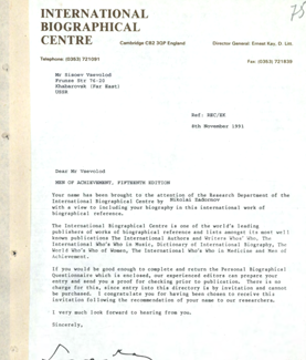 Переписка с International biographical center (Кембридж, Англия) (ГАХК. Ф. 1243. Оп. 1. Д. 217. Л. 75-76)
