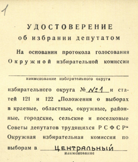 Удостоверение об избрании депутатом (ГАХК. Ф. 1243. Оп. 1. Д. 158. Л. 1об.)