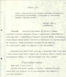 Слово, произнесенное на собрании писателей-коммунистов Хабаровской писательской организации и редколлегии журнала «Дальний Восток», декабрь 1988 г. [машинописный автограф]