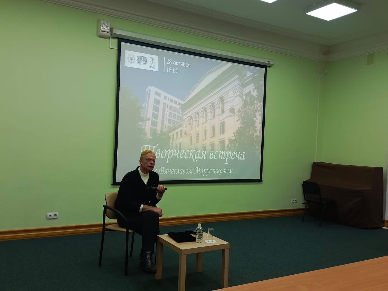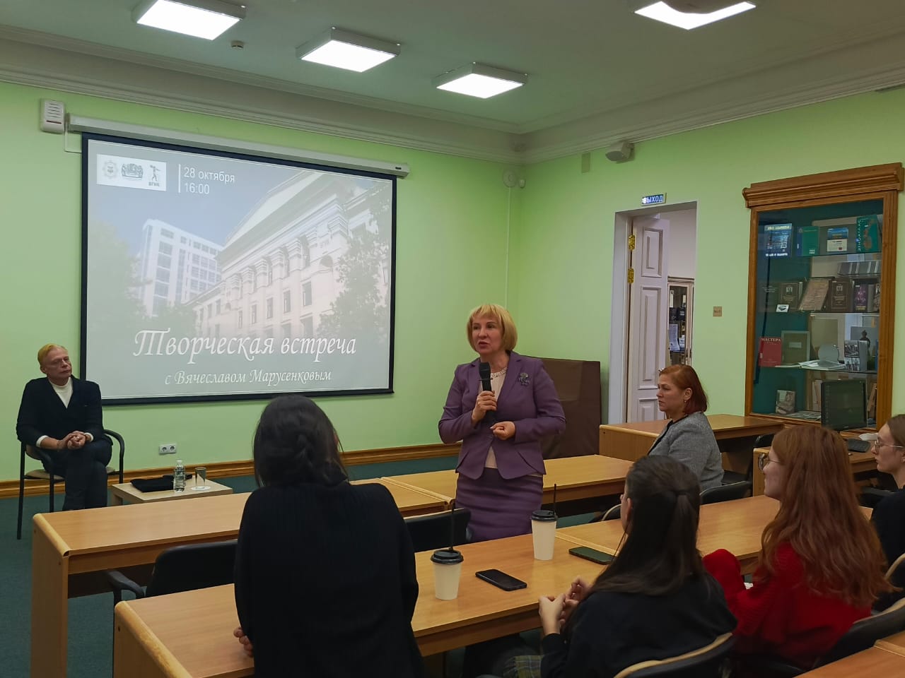 28 октября в ДВГНБ состоялась творческая встреча с Вячеславом Валентиновичем Марусенковым – кинодраматургом, кандидатом искусствоведения, деканом сценарно-киноведческого факультета Всероссийского государственного института кинематографии имени С. А. Герасимова (ВГИК), членом Союза кинематографистов России.