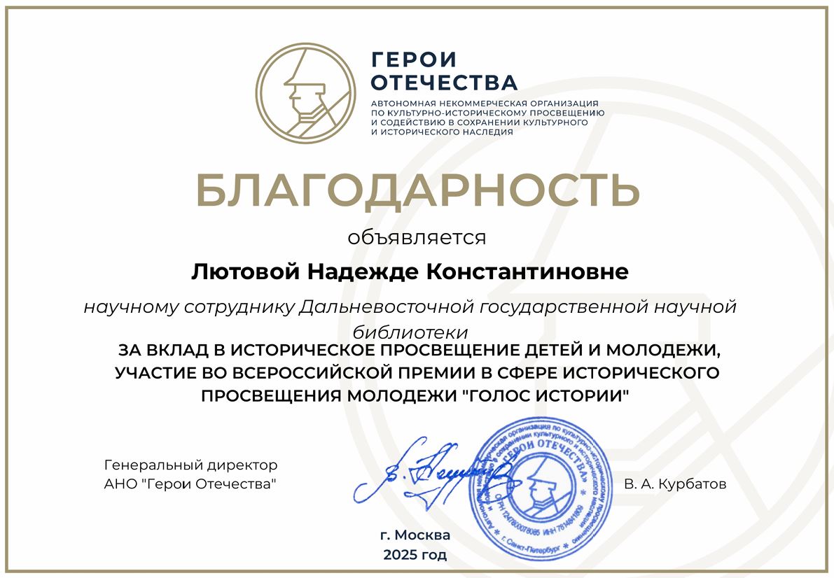Дальневосточная государственная научная библиотека и АНО «Лаборатория идей» приняли участие во Всероссийском конкурсе инициатив по сохранению исторической памяти, организованном Национальным центром исторической памяти при Президенте Российской Федерации и Центральным советом сторонников Всероссийской политической партии «Единая Россия», а также во Всероссийской премии в сфере исторического просвещения молодёжи «Голос истории», организованной Автономной некоммерческой организацией по культурно-историческому просвещению и содействию в сохранении исторического и культурного наследия «Герои Отечества».