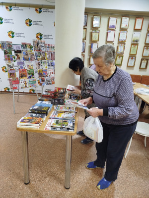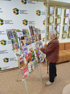 Выставка работала в рамках передвижной библиотеки, которая один раз в месяц выезжает в дом ветеранов для обмена прочитанных книг.